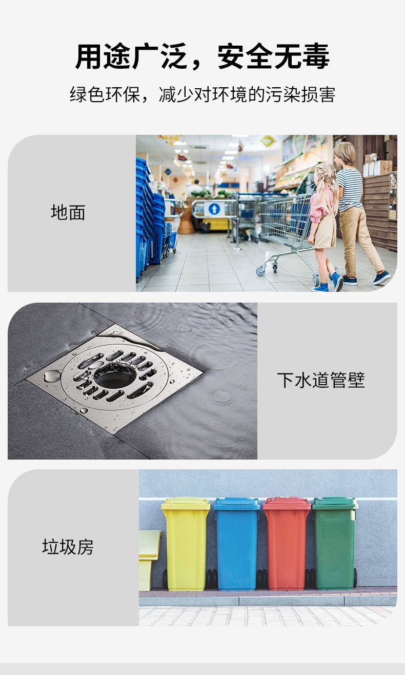 El Desodorizante de Residuos es ideal para eliminar los olores difíciles de los pisos ocupados y cercanos, desagües, rincones turbios difíciles de limpiar, montones de residuos, cubos de basura, carros de basura, estanques de residuos y suelos malolientes.