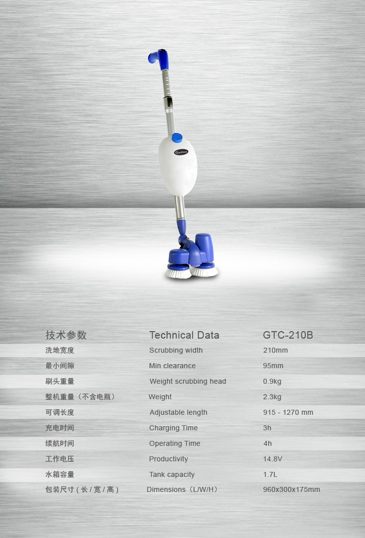 GTC-210B has an “ergonomically” designed handle with many features such as adjustable variable shaft length and angle. The heavy duty battery lasts up to 4 hours. The brushes are designed for hard to reach areas, corners and niches. It also has a snap on attachment grip for the scrubber head, for easy replacement.