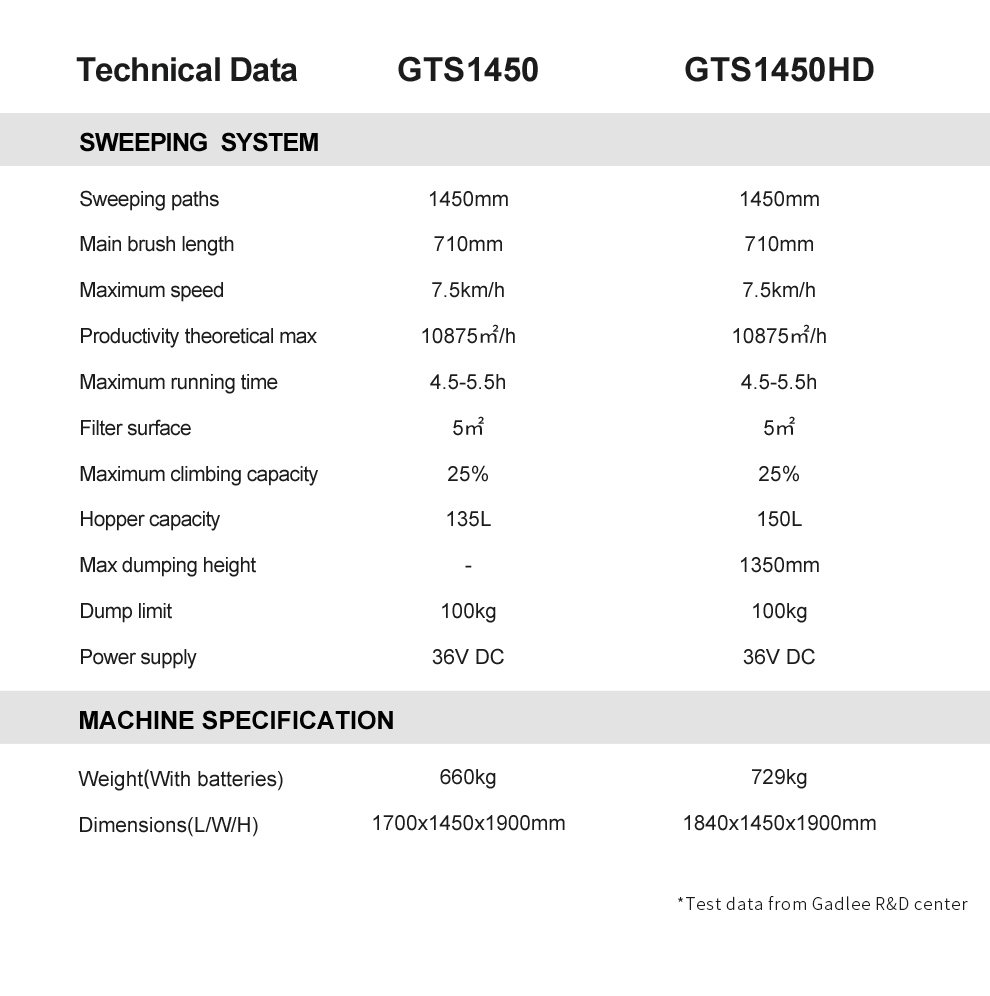 GTS1450 HD is a ride-on sweeper with a high dump designed for maximum performance. With a cleaning capacity of up to 10,875 m² per hour, the machine is equipped with a heavy-duty PTFE filter system. It is ideal for both outdoor and indoor sweeping applications such as parking lots, pathways, railway stations, loading bays, warehouses, and industrial settings.