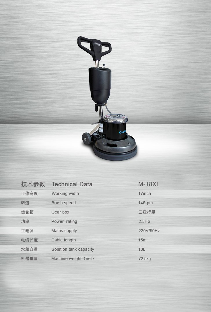 The Gadlee C-18X range is suited for medium-duty usage and is capable of scrubbing, wet/dry polishing, shampooing, and floor polishing. Leaving a clean floor with a high gloss.